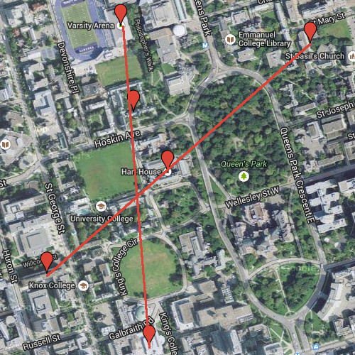 Each of these is a building on the U of T campus. Plotting these buildings, you might see that they form two intersecting lines across campus: