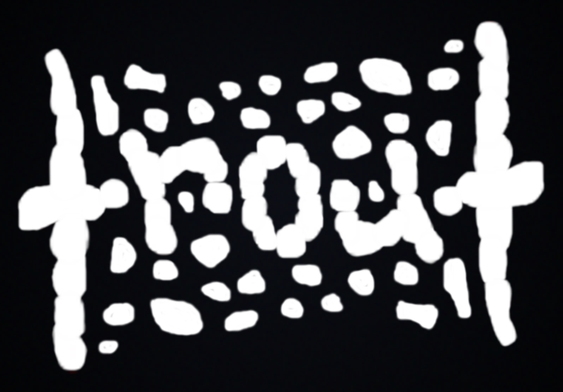 While most people solved this one by removing the rotationally symmetric blobs and trying to form a word with the remaining blobs, we had intended for this one to be solved by rotating the image 180 degrees and superimposing on itself, using the symmetric blobs to align the two copies. This causes the asymmetric blobs to overlap to create a perfectly legible word: trout.