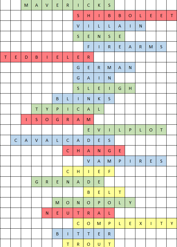 After a little bit of fiddling, since some answers had the same number of characters, the rows should be filled out and the centre column running through the rows gives the final answer.