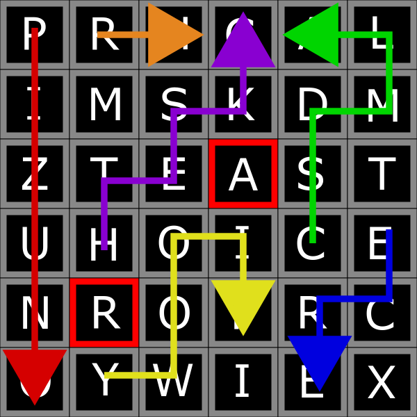Every correct answer to a puzzle gave the teams an arrow. These arrows should be placed on the grid, ensuring that the arrows did not cross each other or into the red squares.
