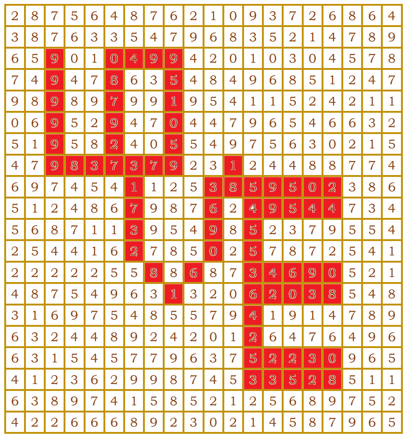 The text makes references to Feynman and pi (pies). There is a sequence of 6 nines in pi which is given the special name the "Feynman point". Starting at the sequence of 6 nines in the grid and continuing with the next digits of pi, the trail spells "LOVE".
