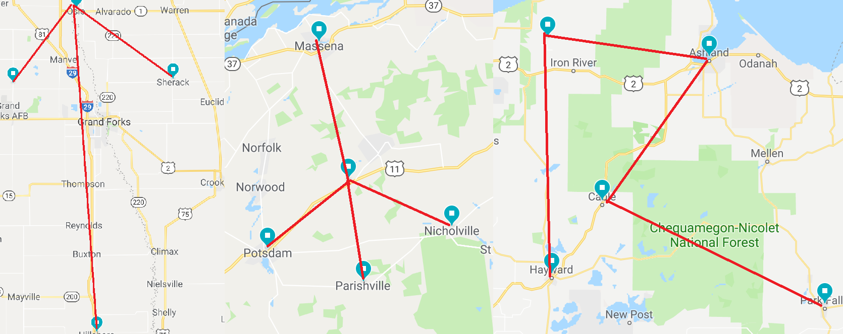 All of the locations in this puzzle are cities/towns in the United States. The below symbols are achieved by mapping each set and connecting the towns in order. The towns "Oslo", "Stockholm", and "Oulu" hint that the puzzle relates to scandinavia in some way, "Heroes" refers to Norse Mythology, and the symbols from the map are runes of the Norse god Tyr.